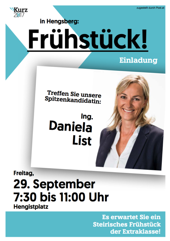 Herzliche Einladung zum Wahlfrühstück am Freitag, 29.9.2017 am Hengistplatz in Hengsberg mit der Spitzenkandidatin Daniela List.